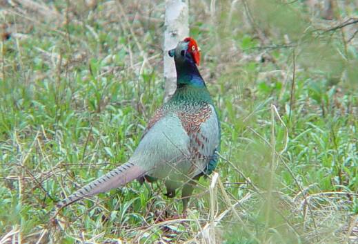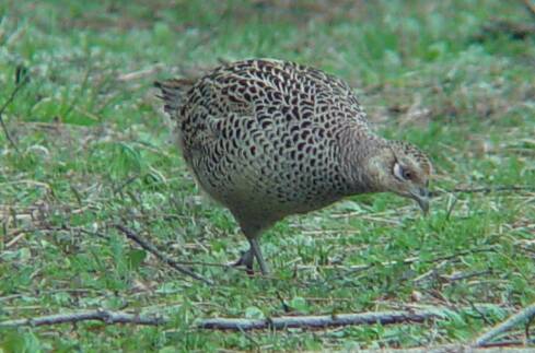| ○艶っぽいキジ ホタルの里と周辺の森との境界付近の草原ではキジをよく見かけます。 普段何気なく見ているのと違って、カメラを通して見たキジはとってもきれいでした。羽には艶があり、りっぱな体格をして、堂々と餌をついばんでいました。オスの赤い肉だれは、春が一番立派だそうです。 メスもどうして、派手さはないけれど艶やかです。 このオスは2羽のメスを引き連れていました。キジは一夫多妻かもしれません。そもそも軽井沢ではオスが少ないそうです。軽井沢には狩猟が認められている場所があり、オスに限り獲ってよいのがその理由らしいです。 ところで、キジの習性に関することで、すごく印象に残った体験があります。 私が小学生の頃、父親が付近の草原で草刈をしていたときのことです。キジのメスがそこで卵を抱いていて、そのすぐそばまで草を刈ったのにメスは逃げずに卵を抱きつづけていたのです。あやうくそのメスを刈ってしまうところでした。 そのあと私はそのメスのすぐ近くで(おそらく1メートルぐらい離れた場所で)メスが卵を抱く姿をじっと眺めていました。いっこうに逃げようとしませんでした。 キジの母性本能ってすごいですね! |