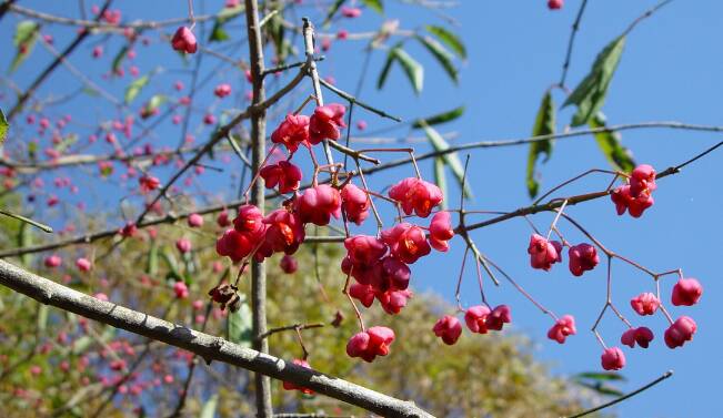 | ○マユミ、「花」盛り 秋も深まった林を歩いていると、突然春のように「咲き」誇っているマユミの木に出くわしました。 こんなに派手に実をつける木は、他にはないでしょう。 |