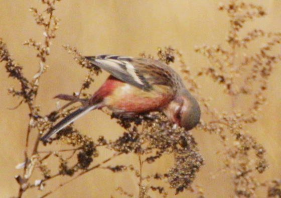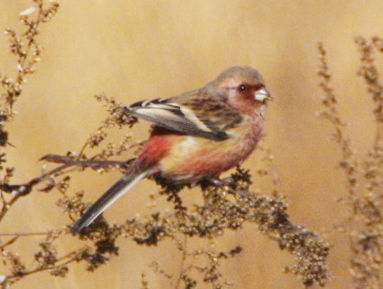 | ○やっぱり今はベニマシコ ベニマシコ、バードウォッチャーの憧れの鳥(のひとつ)だそうですね。 あのポイントに行くと、ほとんど必ず出会えます。 今日は4羽そろって草むらで餌を食べていました。でも出会えたからといっていい写真が撮れるとは限りません。どうしても背景が明るいところでの撮影になるので露出の設定をなんども失敗しました。 カメラ(D30)のマニュアルをよく読んでみると明るさの分布をグラフ表示する機能があることがわかり、今日はそれを使って撮影しました。 でも今度は近くでは撮れませんでした。チャンスはあったんだけど、ピントを合わせている間に逃げられました。 草むらのベニマシコ、オートフォーカスではピントが来ないのでマニュアルでピントをあわせるのですが、これが難しいです。 とにかく数を撮って、1−2枚よければいいやっていうやり方です。100枚に1−2枚しかましなのがありません。 |