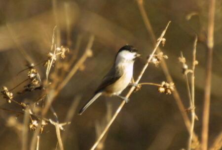 林のふちの草むらでシジュウカラの群れが餌を食べているので見ていたら、一羽のコガラがさっと飛び込んできて、餌をついばむや否やさっと林に逃げて行きました。