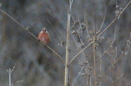 草地に近づいたとき数羽のキジが大きな音を立てて飛び立ったので、今日はベニマシコには会えないかと思いましたが、やや遠くの草の枝にとまっているのを見つけました。