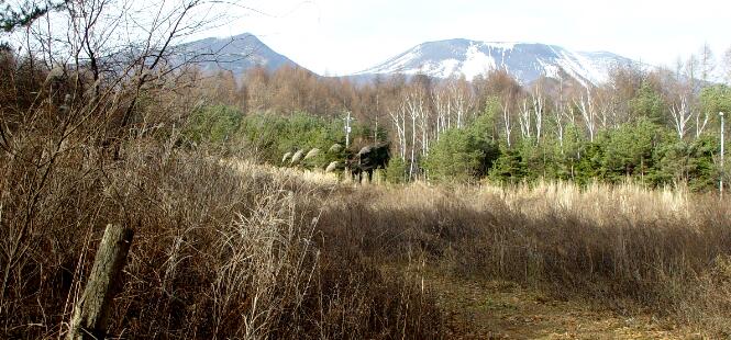 手前の草地の中で餌を食べていました。草地の向こうは国有林で浅間山に続きます。