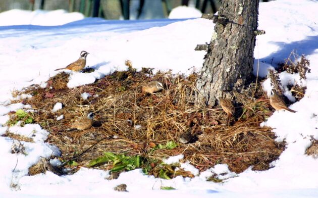 6羽のホオジロが、南斜面の雪が解けた場所で餌を探していました。どんな餌があるのでしょう?