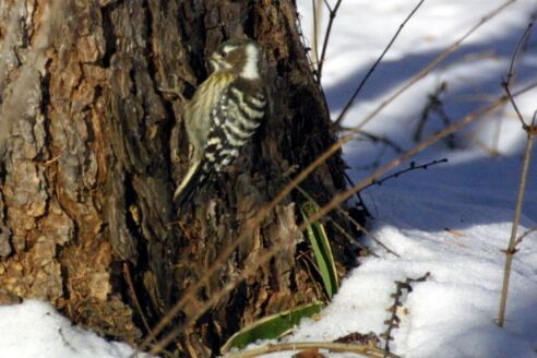 もう必死で太い幹から細い枝先までせわしくつついて動き回っています。私が近くにいてもお構いなく虫探しです。数分私の周りの木を探し、徐々に遠ざかって行きました。